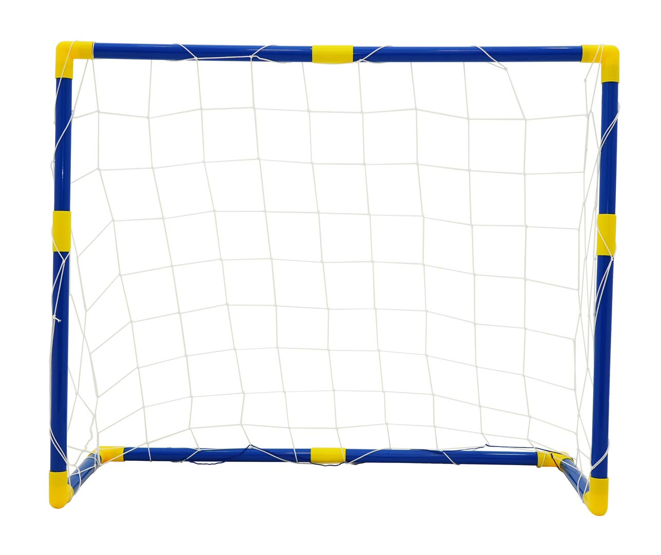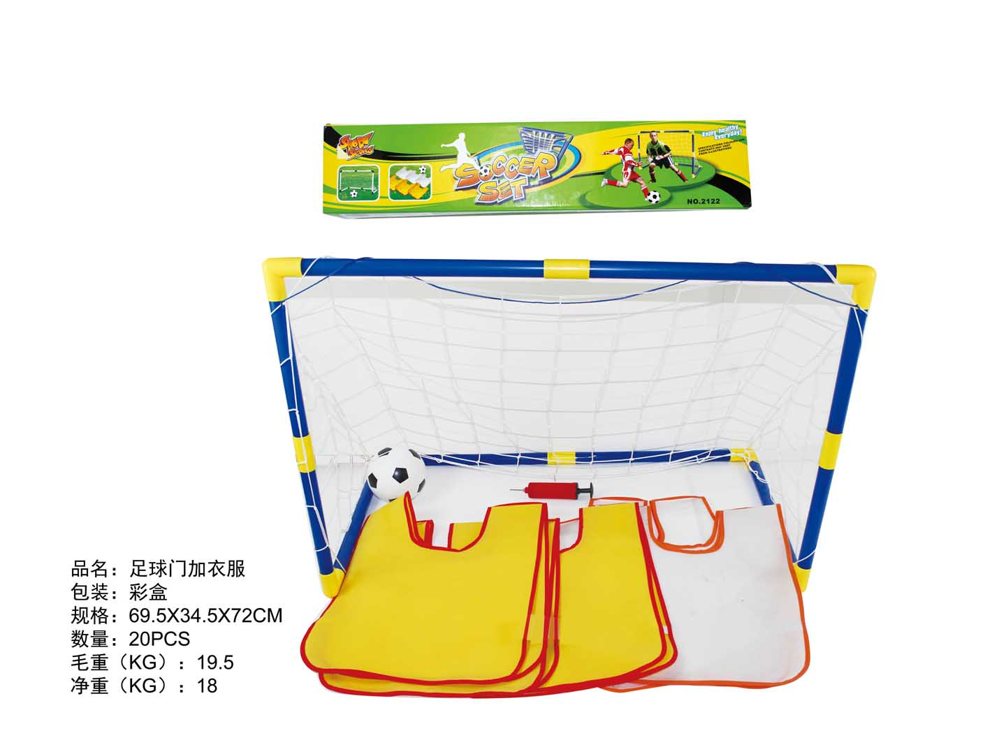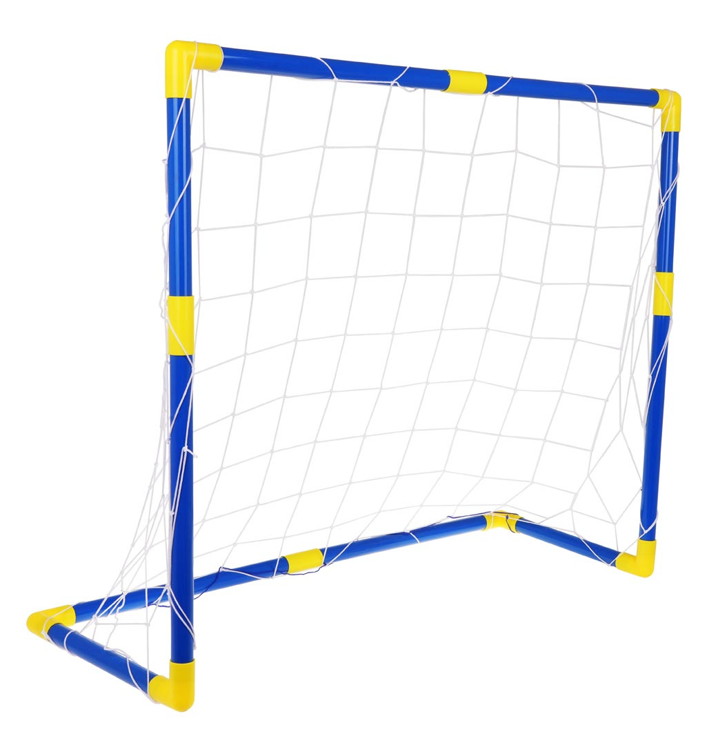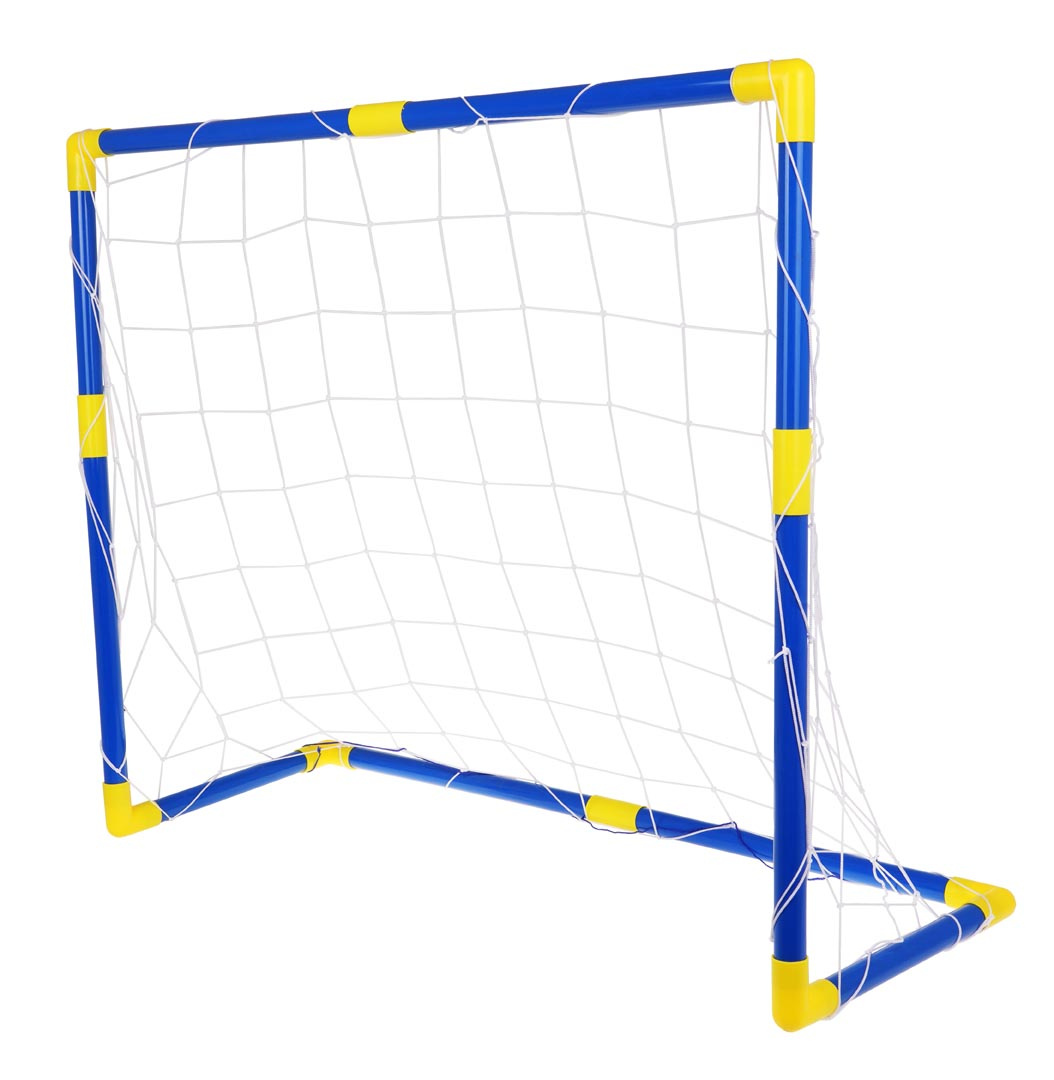 Velká branka do zahrady s doplňky pro děti od 3 let. V sadě se nachází modrá branka se žlutými spojkami, síť, vesty v bílé a žluté barvě a míč s pumpičkou.
