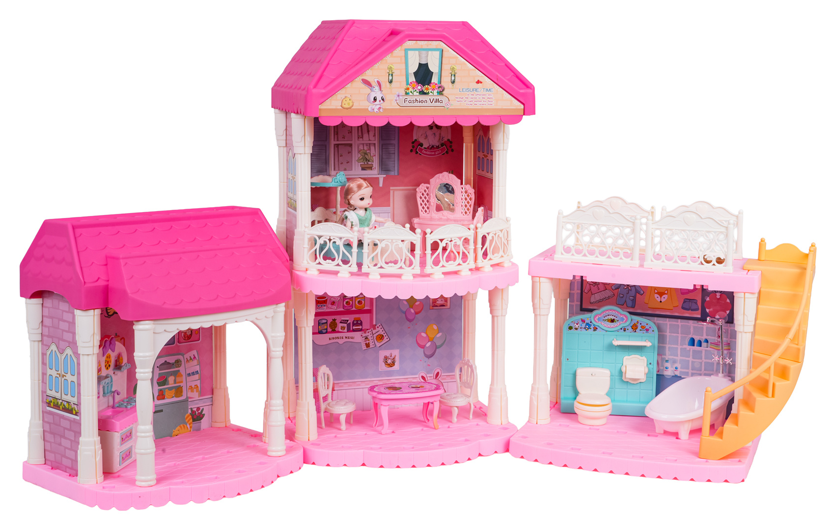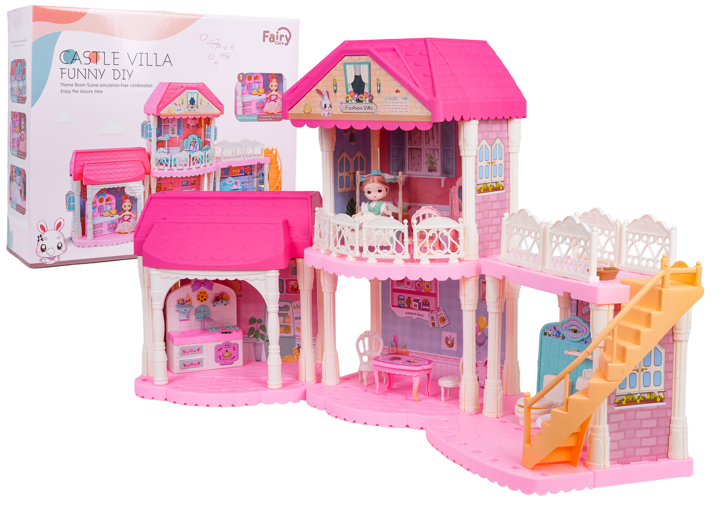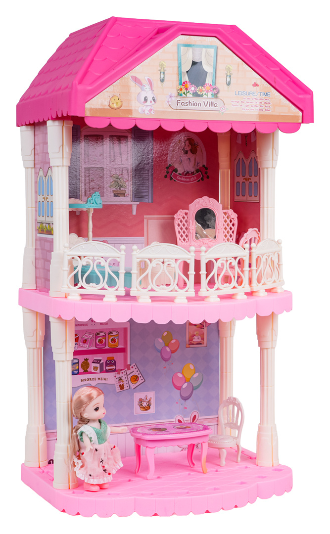 Krásný, růžový, velký domeček s vybavením a panenkou v sadě pro děti od tří let. Domek se skládá ze 3 samostatných modulů, které lze skládat v libovolných kombinacích. V domku najdeme kompletně vybavený obývací pokoj, koupelnu, kuchyň a šatnu. Sada je vyrobena z nejkvalitnějšího plastu v živých barvách, které přitahují pozornost dítěte.