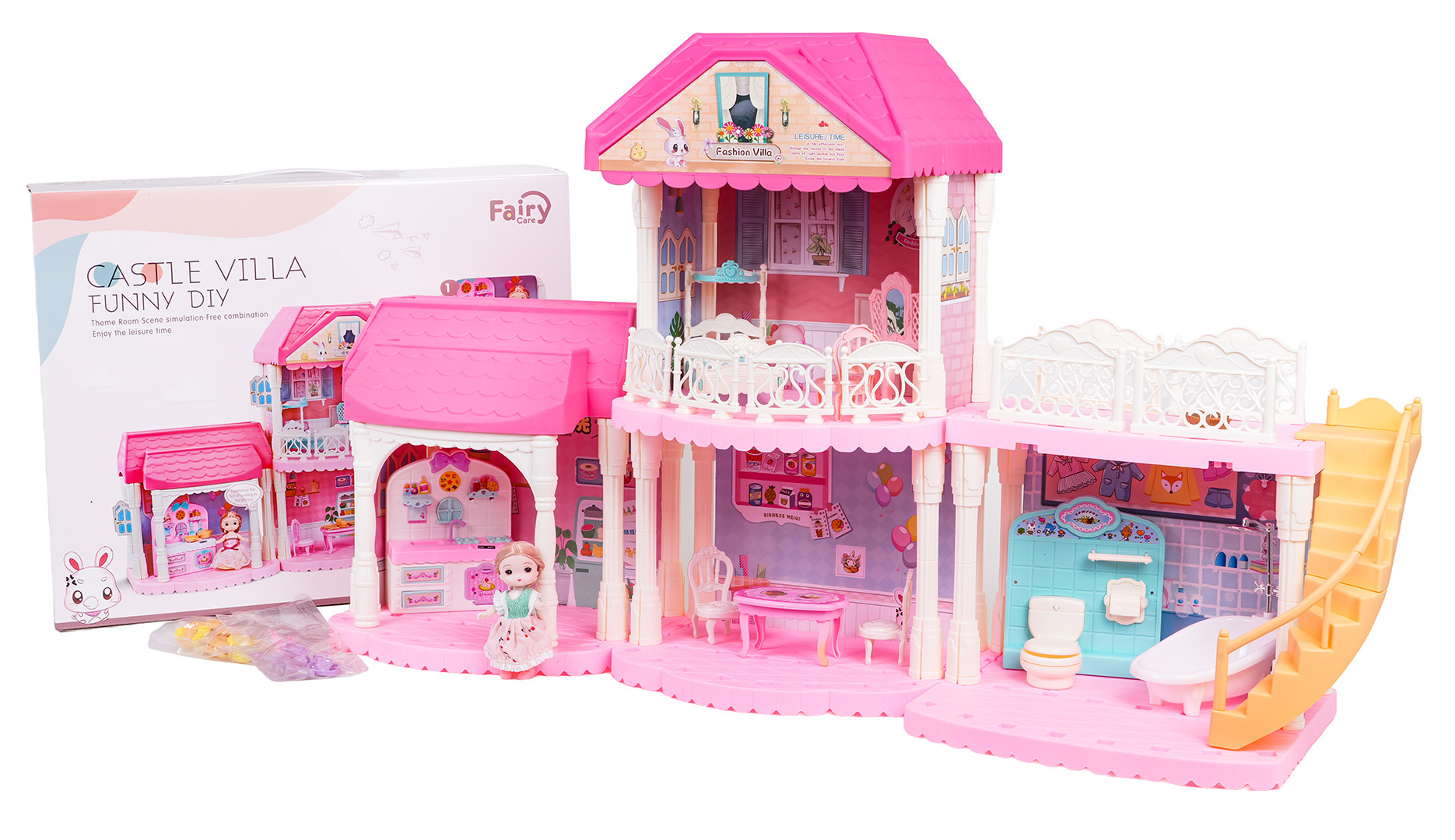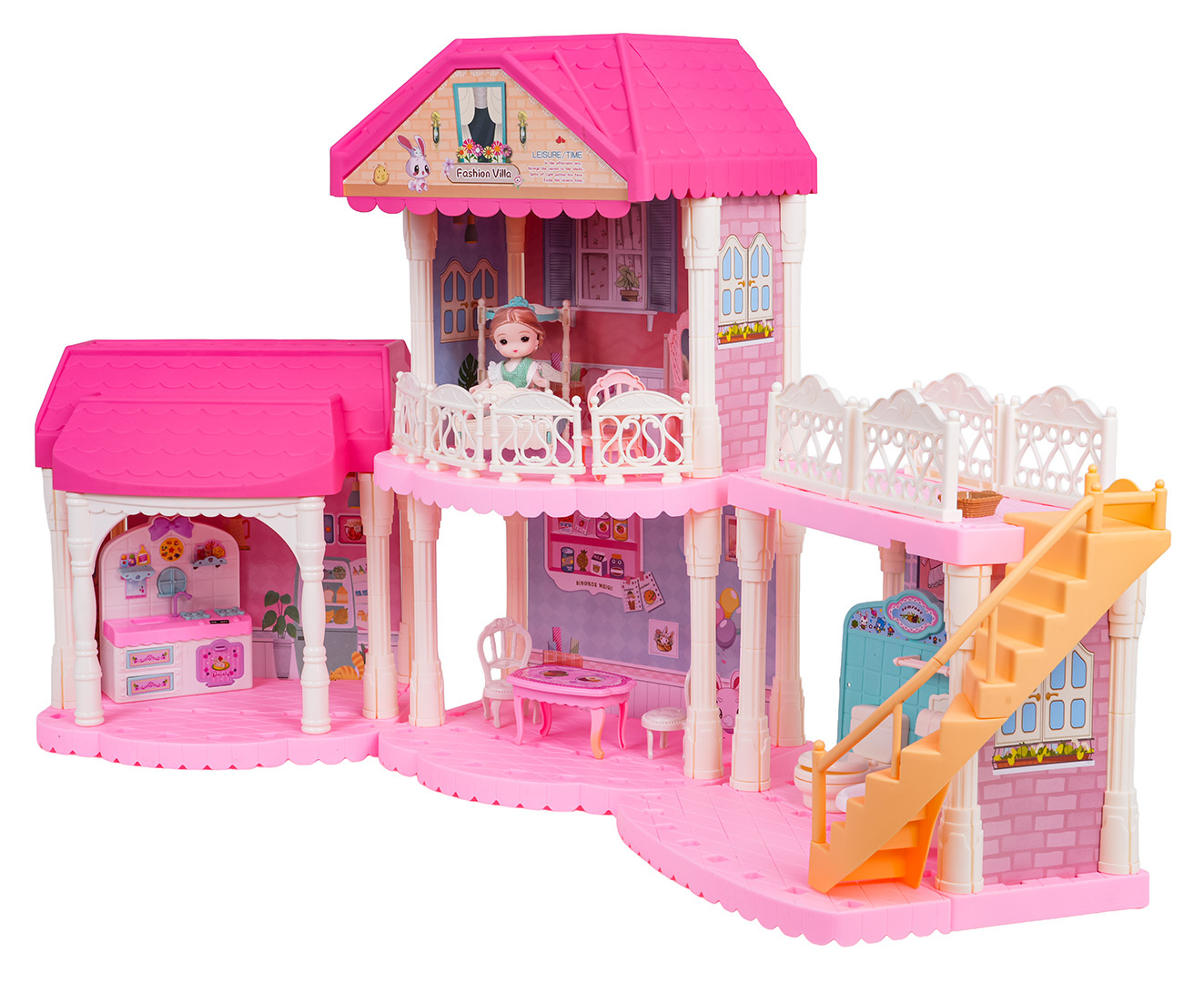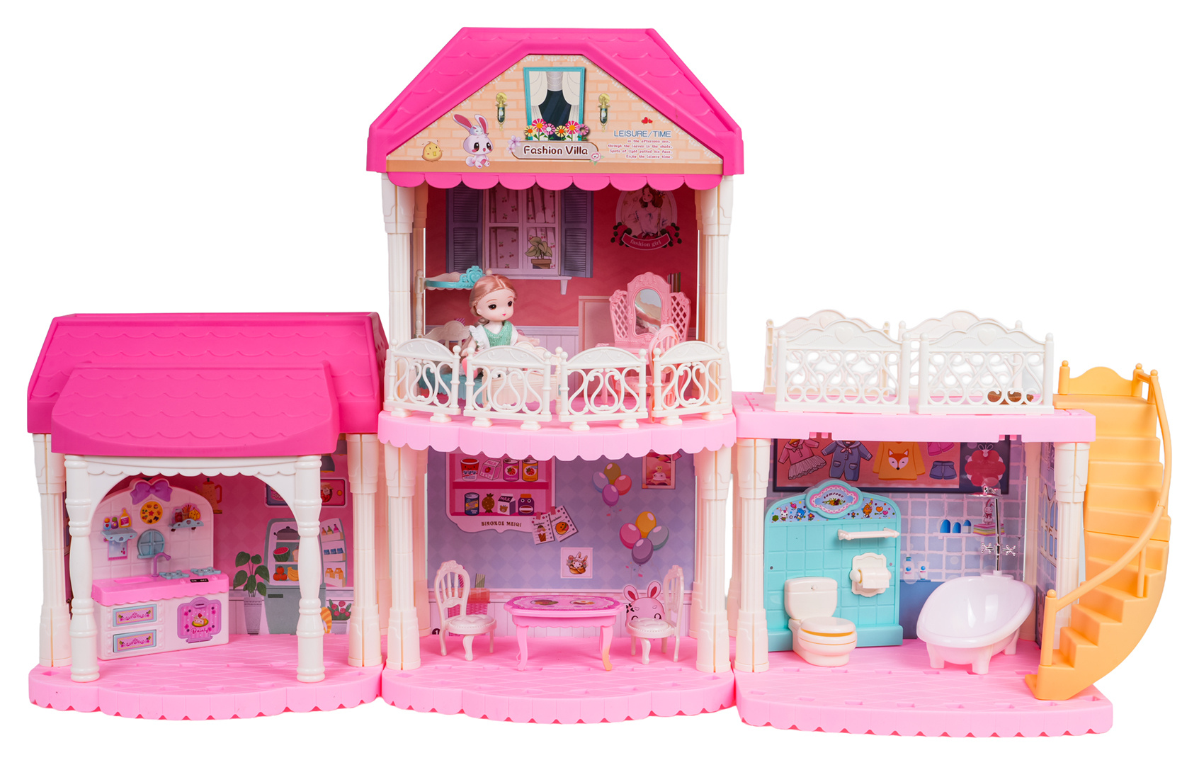 Krásný, růžový, velký domeček s vybavením a panenkou v sadě pro děti od tří let. Domek se skládá ze 3 samostatných modulů, které lze skládat v libovolných kombinacích. V domku najdeme kompletně vybavený obývací pokoj, koupelnu, kuchyň a šatnu. Sada je vyrobena z nejkvalitnějšího plastu v živých barvách, které přitahují pozornost dítěte.
