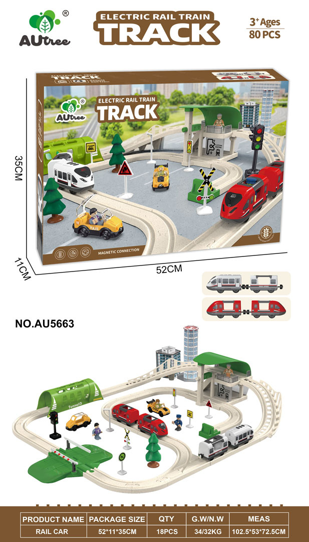 Interaktivní vláček pro děti od tří let. Sada je vyrobena z bezpečných a odolných materiálů, což zaručuje její spolehlivost a dlouhou životnost. V sadě se nacházejí koleje, po kterých se pohybují dva vlaky, budova stanice, tunel a také železniční závora. Na vybavení máme také dvě vozidla, městské budovy, dopravní značky a figurky. Tato sada nabízí mnoho možností kreativní zábavy. Tunel je napájen bateriemi typu 3 x AG13 (v balení), projíždějící vlak spouští zvuky jízdy vlaku a barevná blikající světla. Železniční stanice je napájena bateriemi typu 3 x AG3 (v balení), má podsvícení a vydává zvuky jízdy vlaku. Semafor je napájen bateriemi typu 3 x AG3 (v balení), vydává zvuky charakteristické pro měnící se světla a má světelné efekty. Bílý vlak je napájen bateriemi typu 2 x AAA 1,5V (nejsou součástí balení), jezdí dopředu a dozadu, vydává zvuky jízdy a má podsvícené přední reflektory.