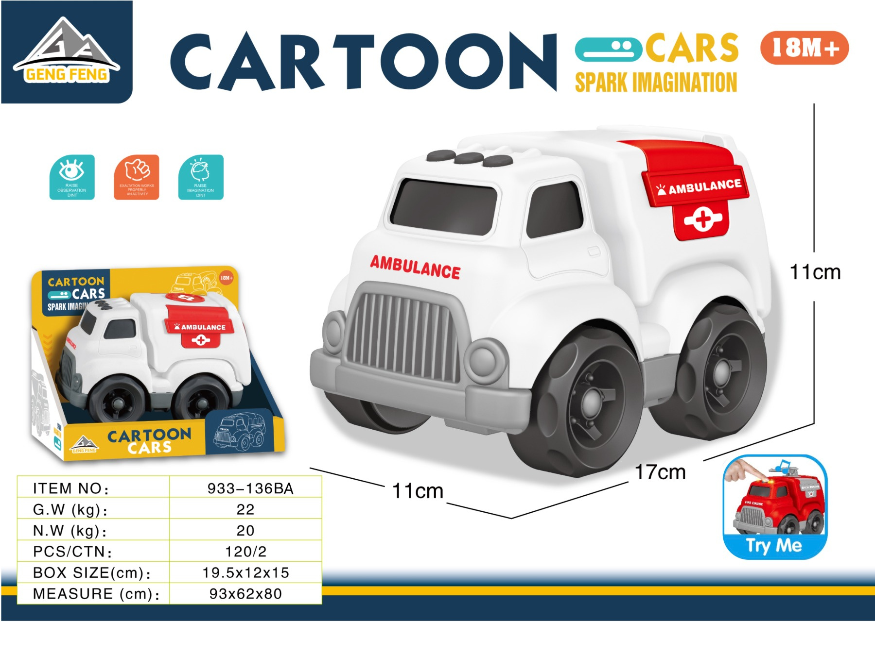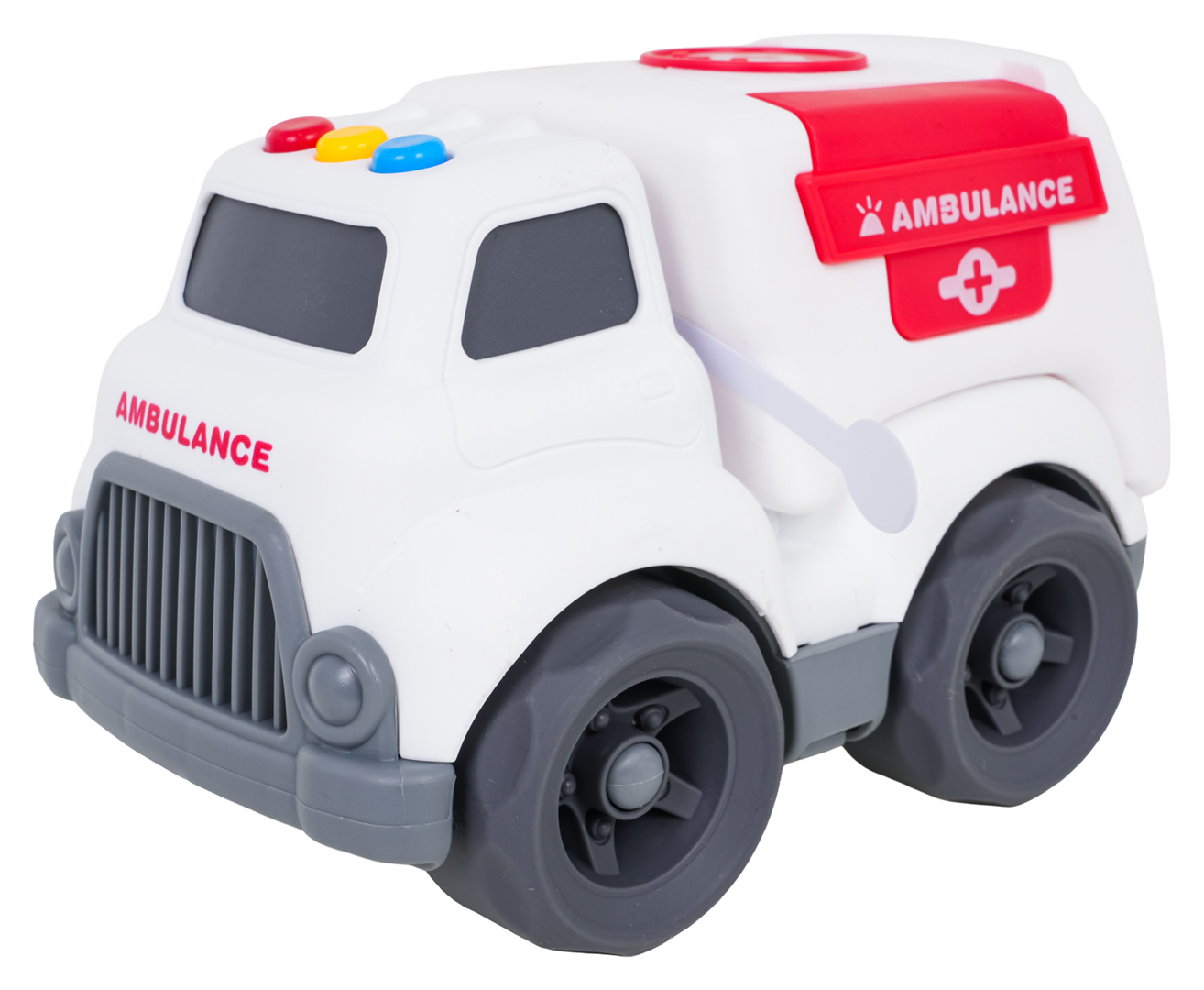Interaktivní sanitka pro děti od osmnáctého měsíce života. Hračka byla vyrobena z nejkvalitnějších materiálů a nemá žádné ostré hrany. Na střeše sanitky se nacházejí zvuková a světelná tlačítka, po jejichž stisknutí je slyšet zvuky startování vozidla, jízdy, couvání a veselou melodii. Blikají také světýlka na střeše. Hračka je napájena bateriemi typu 4 x LR44 (v balení).