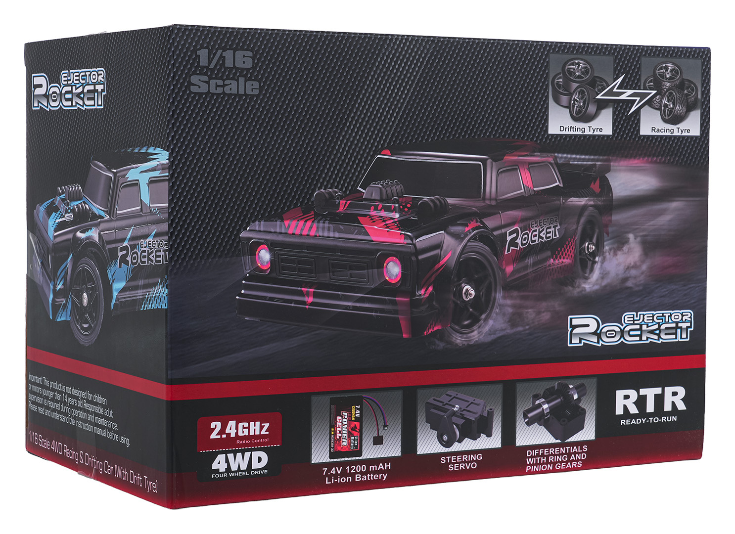 Dálkově ovládané vozidlo pro drift, vyrobené v měřítku 1:16, pro děti od čtrnácti let. Karoserie vozidla je vyrobena z odolného plastu, aby zvládla i ten nejbláznivější drift. Hladká kola umožňují vozidlu bez námahy vjíždět do ostrých zatáček s kontrolovaným smykem. V balení se nacházejí také další 4 pneumatiky s běhounem, pro standardní závody. Vozidlo jezdí všemi směry: dopředu, dozadu, zatáčí doleva a doprava a driftuje. Model je napájen akumulátorem 7,4V (v sadě), ovladač bateriemi typu 3 x AA 1,5V (nejsou v sadě).