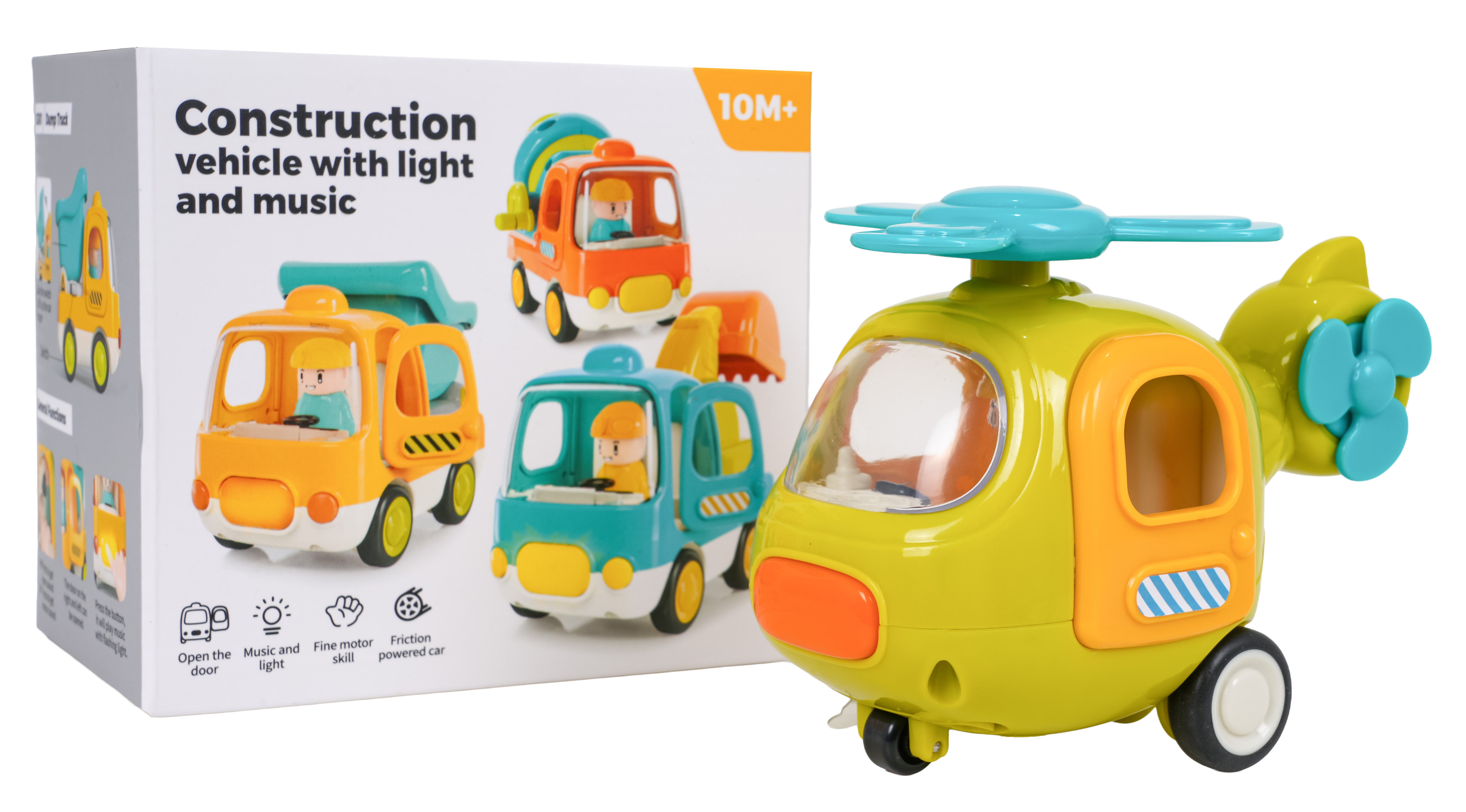 Interaktivní helikoptéra s funkcí zvuku a světla pro děti od desátého měsíce života. Hračka je vyrobena z odolného a bezpečného plastu, nemá ostré hrany a vydrží i tu nejenergičtější hru. Živé barvy přitahují pozornost dítěte a povzbuzují ke hře. Zvukové a světelné efekty stimulují smysly dítěte a dodávají hře na realističnosti. Kolečka se snadno pohybují po podkladu a dveře a vrtule helikoptéry jsou pohyblivé. Hračka je napájena bateriemi typu 3 x AG13 (v balení).