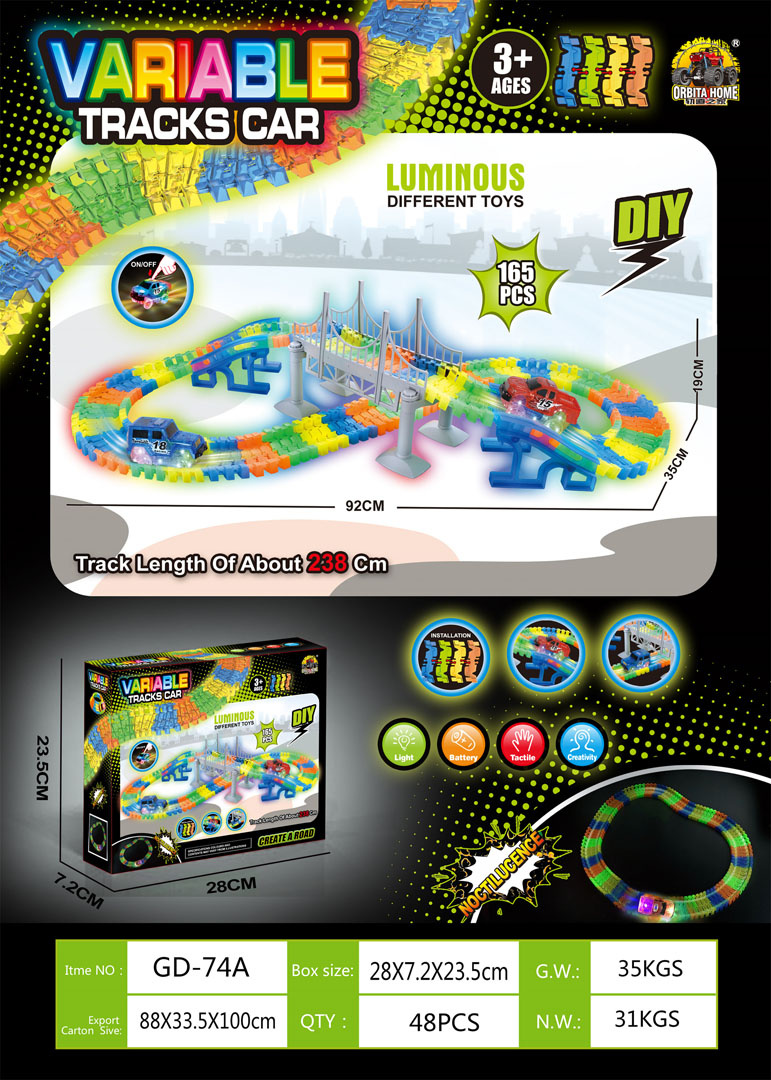 Svítící závodní dráha ve tmě s autíčkem v sadě je nabídkou pro děti již od tří let. Koleje jsou flexibilní, lze je skládat do libovolných kombinací, otáčet, zvedat, přemisťovat a to během jízdy autíčka. Navíc jsou koleje fluorescenční, svítí ve tmě. Vozidlo připojené k sadě má LED osvětlení, při jízdě ve tmě vytváří úžasný efekt. Vozidlo je napájeno bateriemi 2 x AA 1,5V (nejsou součástí balení). K zahájení jízdy autíčka stačí stisknout tlačítko na jeho střeše.