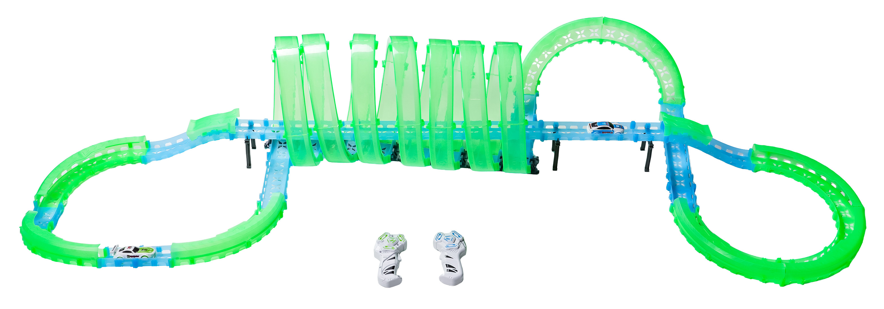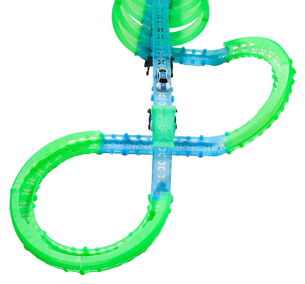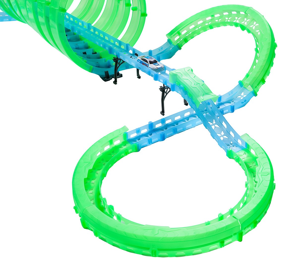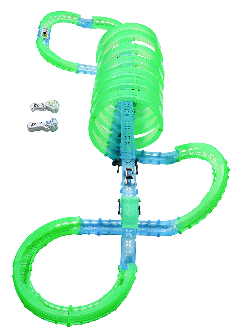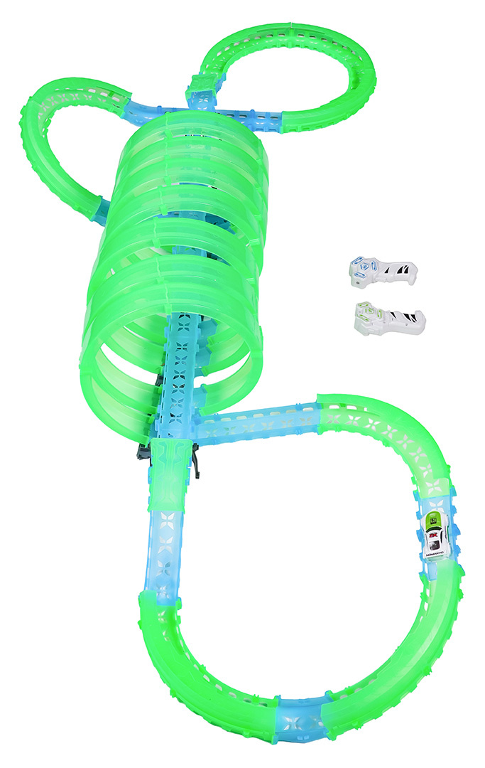 Velká závodní dráha svítící ve tmě je určena pro děti od šesti let. Sada se skládá ze dvou ovladačů, dvou aut a konstrukčních částí dráhy. Dálkové ovladače jsou napájeny bateriemi typu 4 x AAA (nejsou součástí balení), auta akumulátory typu 3,7V (jsou součástí balení). Dráha je fluorescenční, svítí ve tmě. Autíčka mají LED podsvícení, při jízdě vytvářejí úžasné efekty. Hra s dráhou pozitivně ovlivňuje zrakově-pohybovou koordinaci, stavění dráhy podněcuje dětskou představivost a rozvíjí manuální dovednosti.