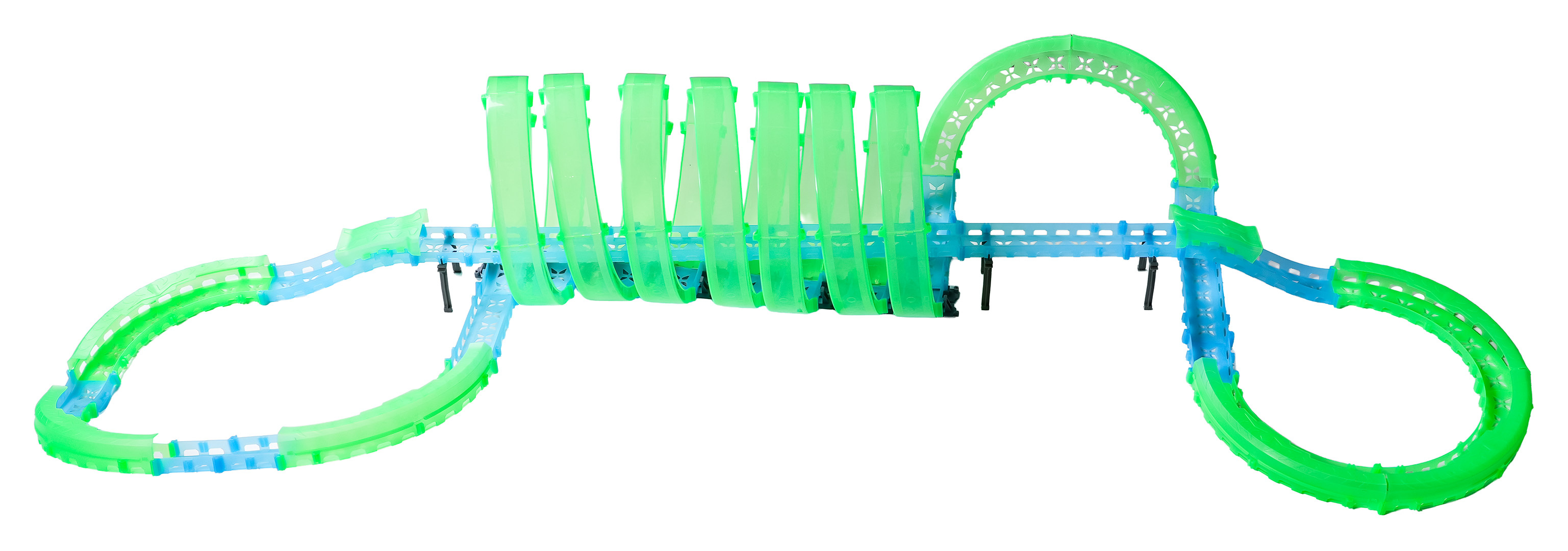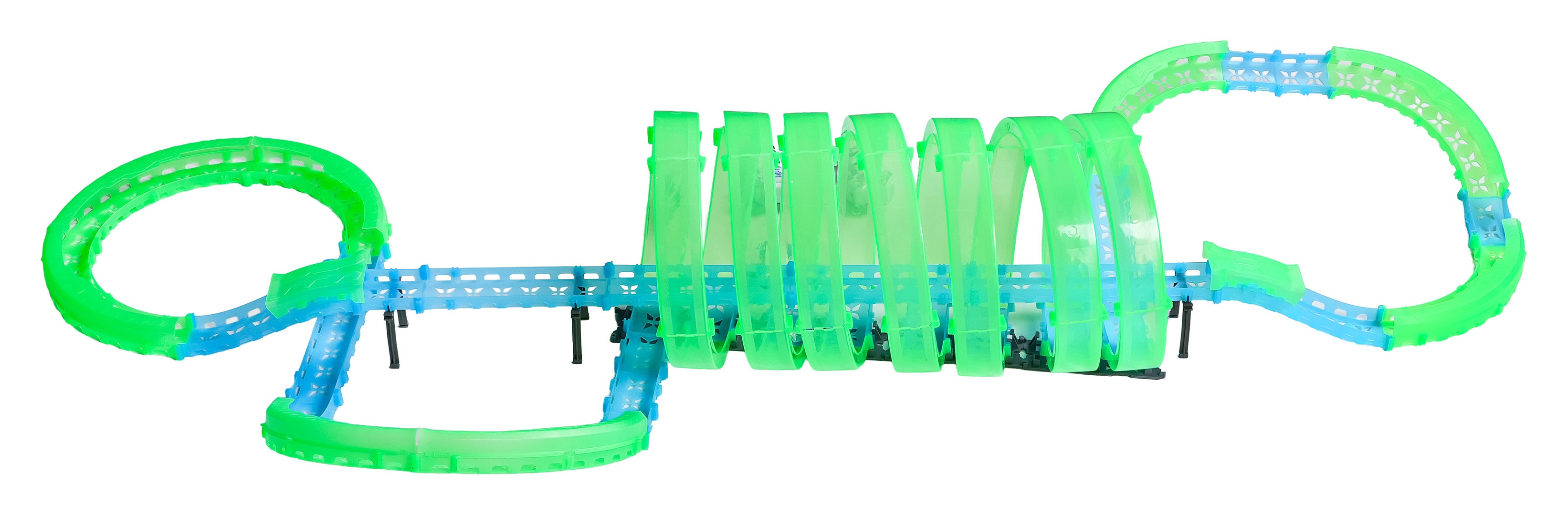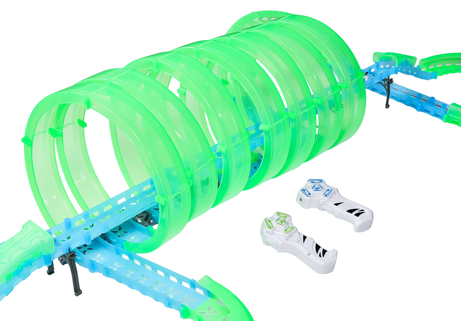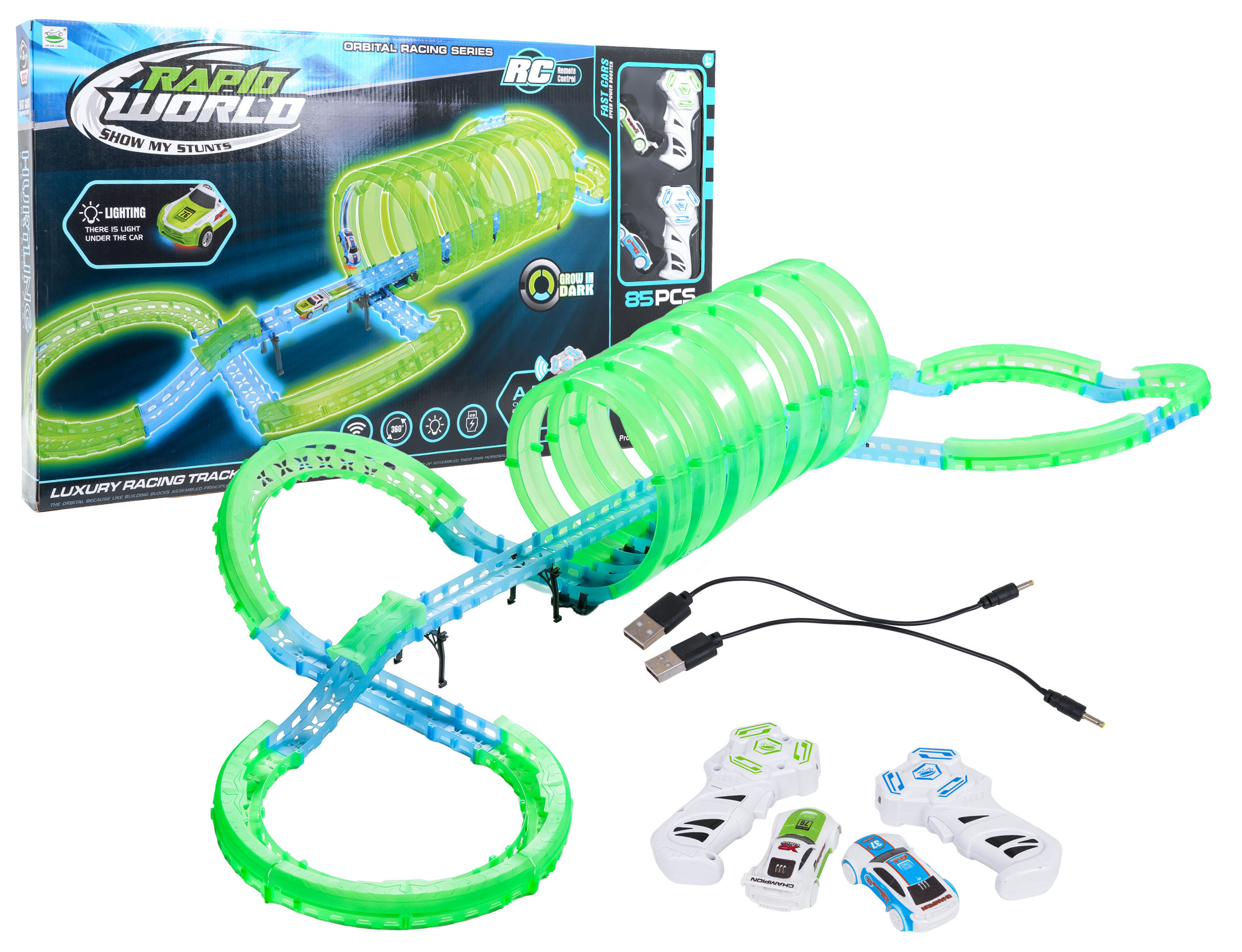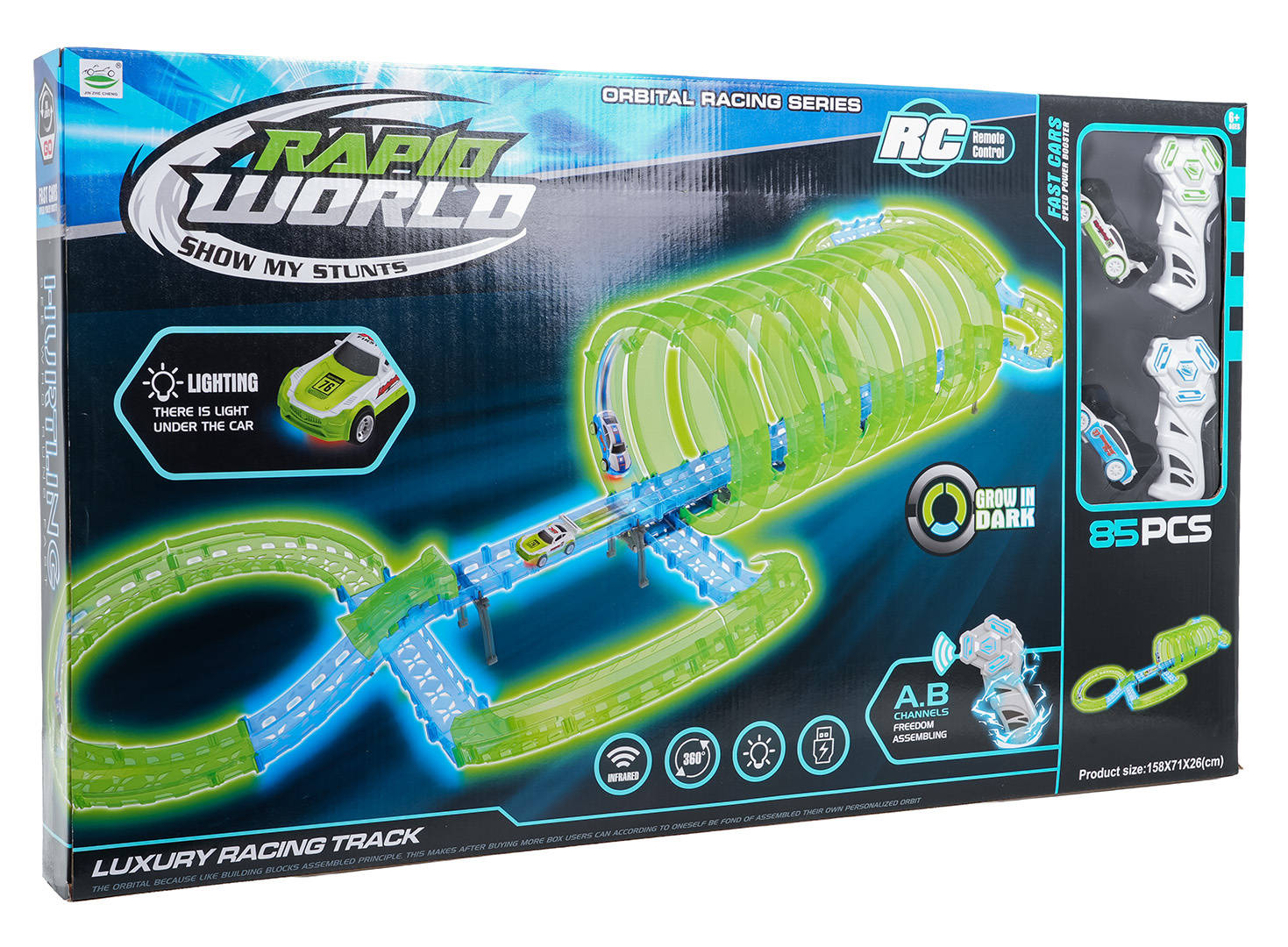 Velká závodní dráha svítící ve tmě je určena pro děti od šesti let. Sada se skládá ze dvou ovladačů, dvou aut a konstrukčních částí dráhy. Dálkové ovladače jsou napájeny bateriemi typu 4 x AAA (nejsou součástí balení), auta akumulátory typu 3,7V (jsou součástí balení). Dráha je fluorescenční, svítí ve tmě. Autíčka mají LED podsvícení, při jízdě vytvářejí úžasné efekty. Hra s dráhou pozitivně ovlivňuje zrakově-pohybovou koordinaci, stavění dráhy podněcuje dětskou představivost a rozvíjí manuální dovednosti.