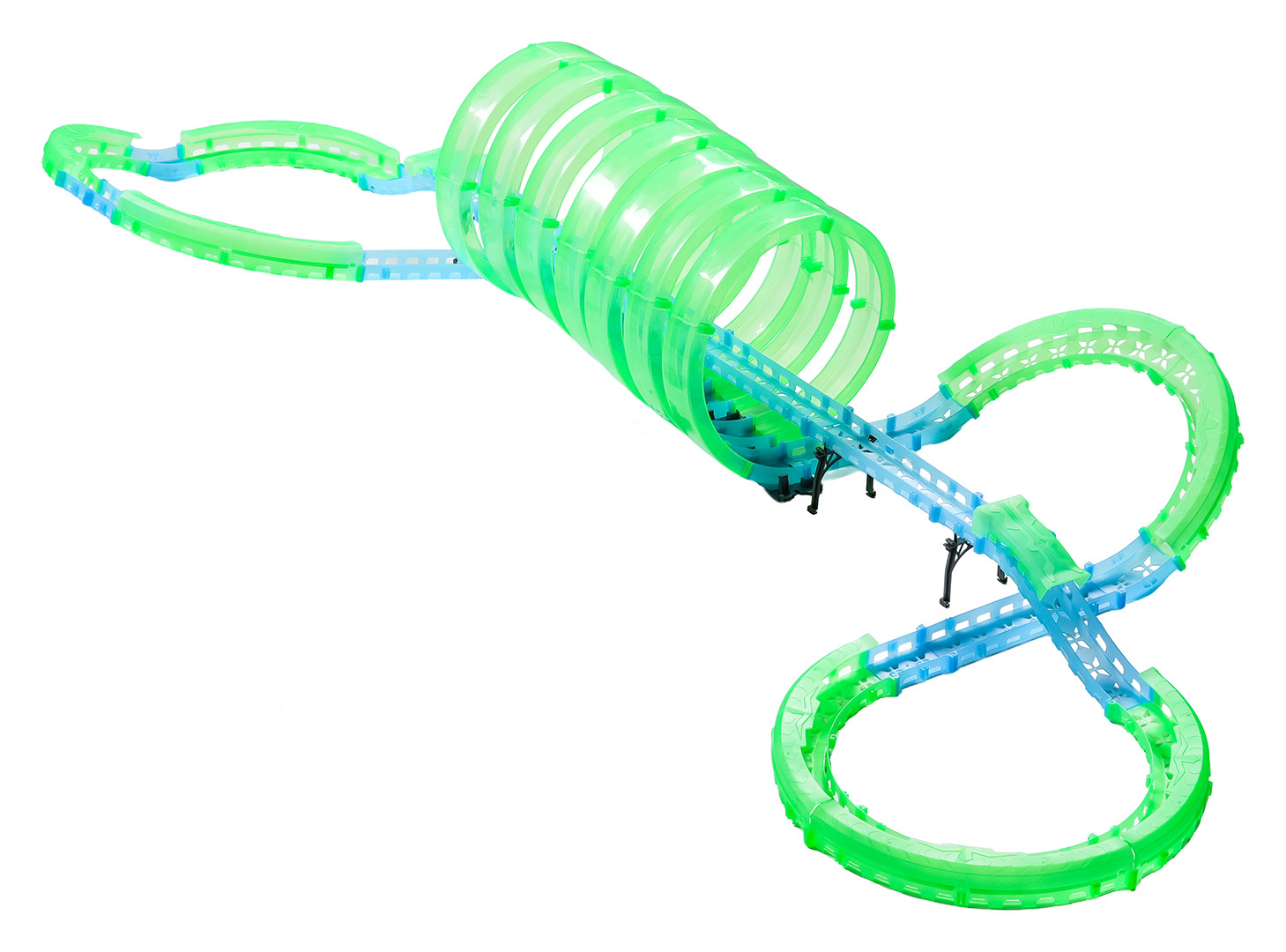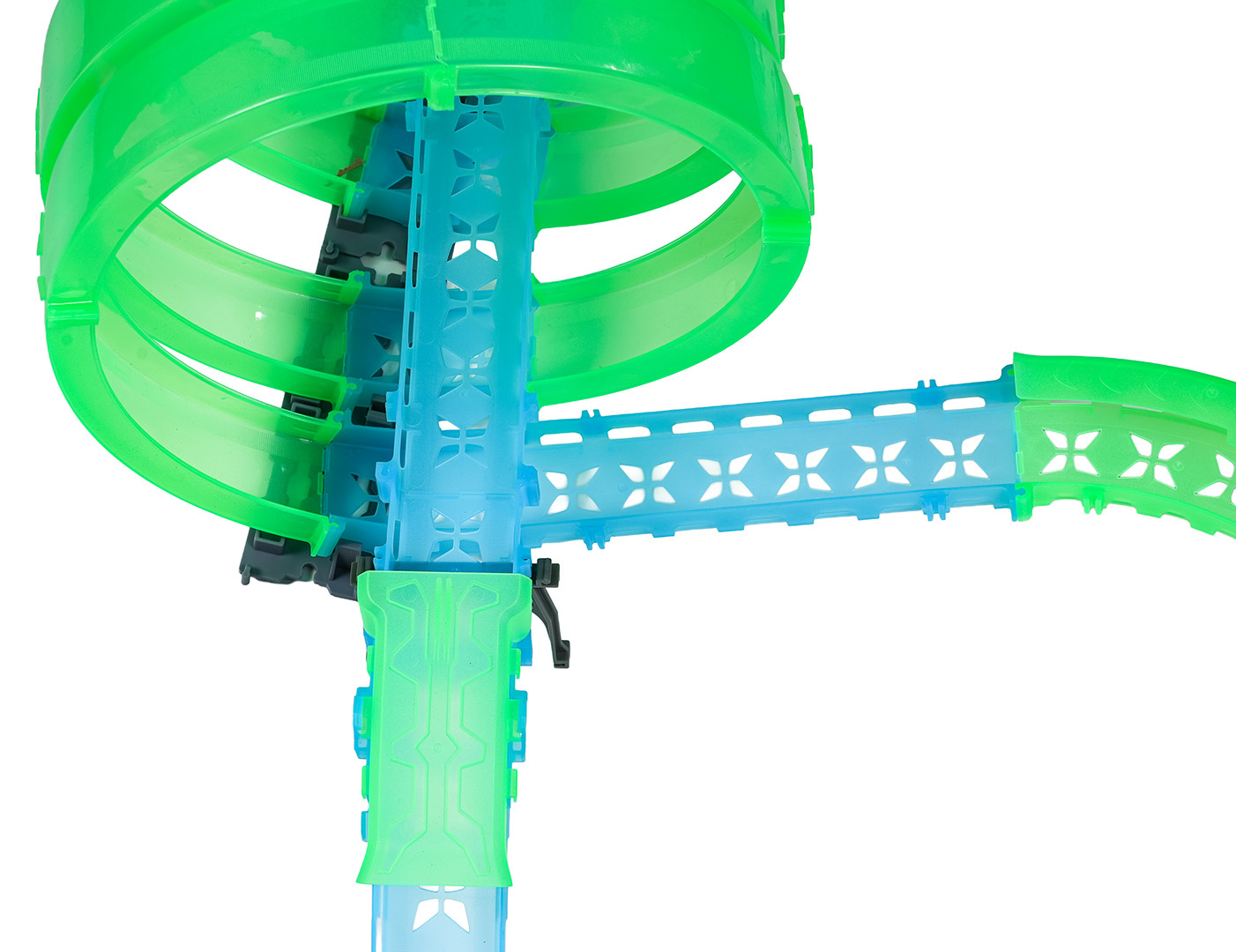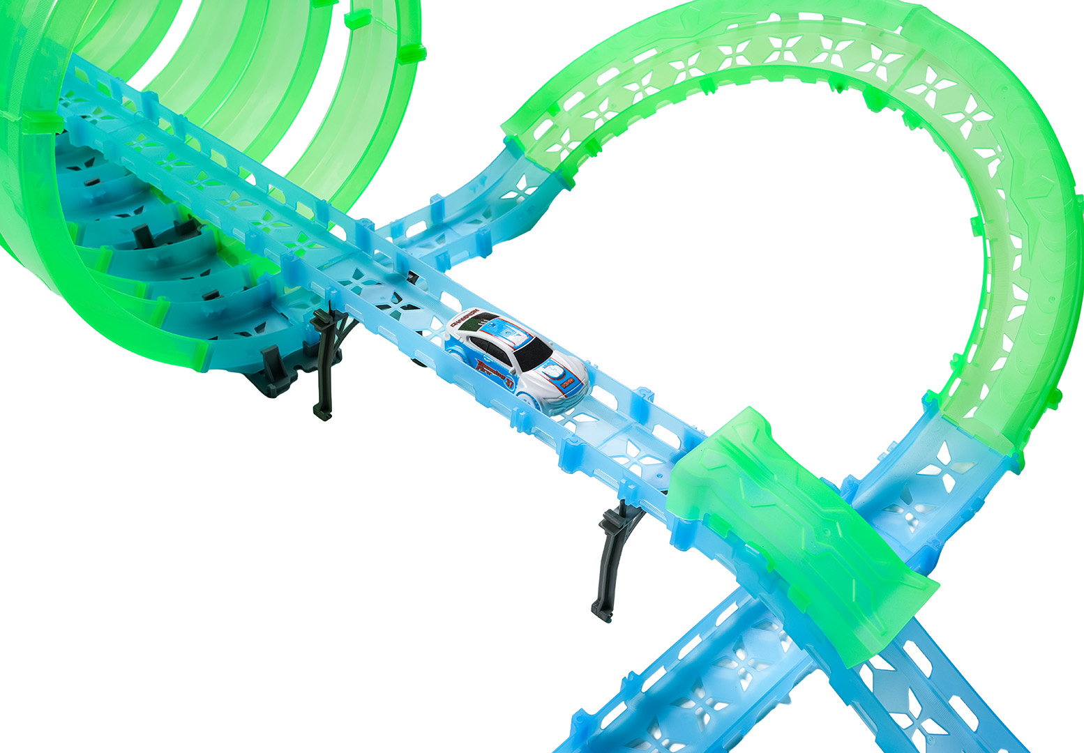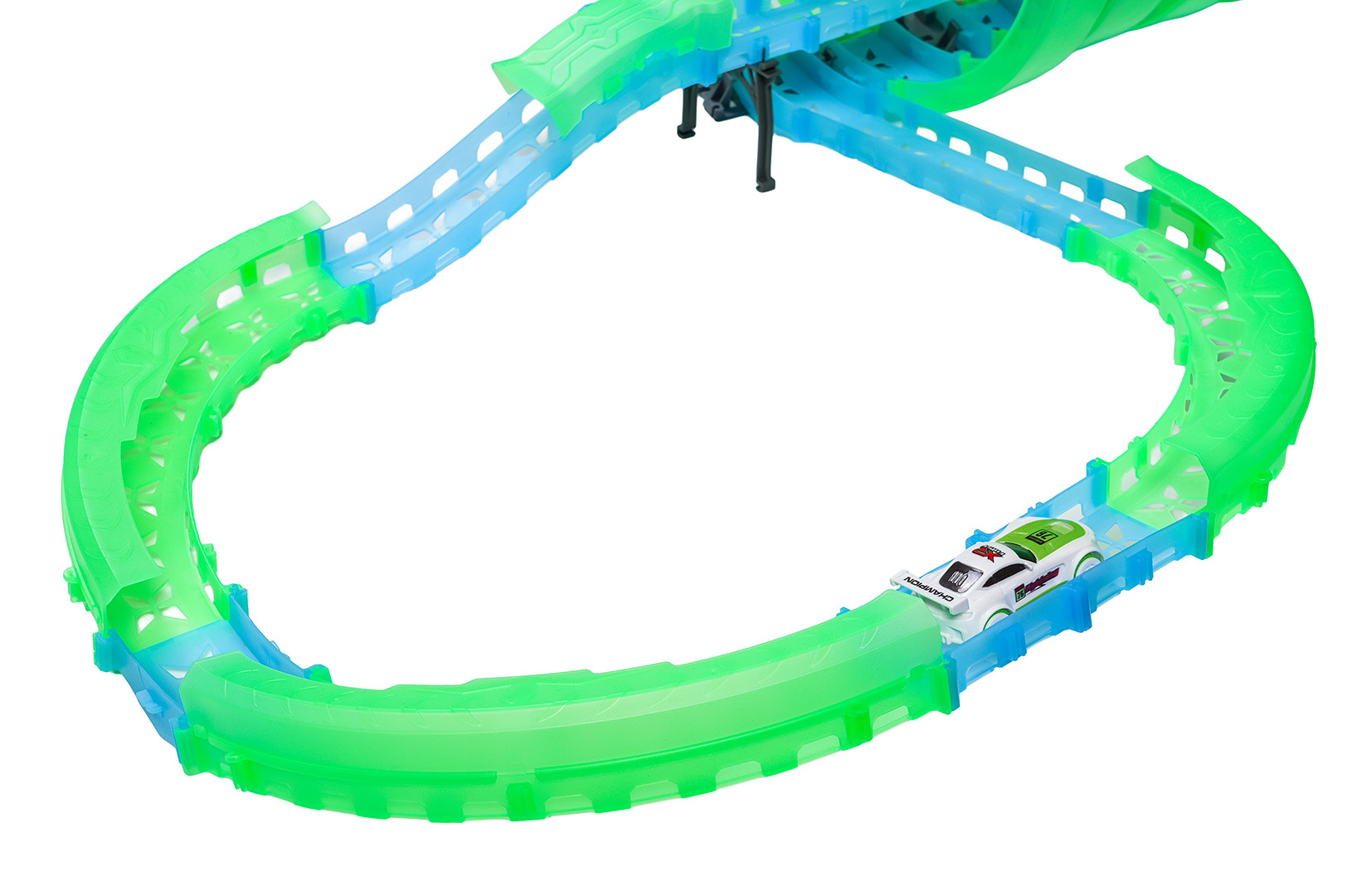 Velká závodní dráha svítící ve tmě je určena pro děti od šesti let. Sada se skládá ze dvou ovladačů, dvou aut a konstrukčních částí dráhy. Dálkové ovladače jsou napájeny bateriemi typu 4 x AAA (nejsou součástí balení), auta akumulátory typu 3,7V (jsou součástí balení). Dráha je fluorescenční, svítí ve tmě. Autíčka mají LED podsvícení, při jízdě vytvářejí úžasné efekty. Hra s dráhou pozitivně ovlivňuje zrakově-pohybovou koordinaci, stavění dráhy podněcuje dětskou představivost a rozvíjí manuální dovednosti.